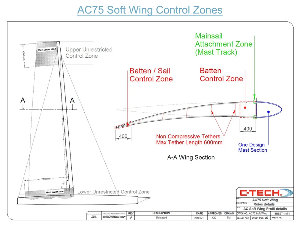 Within tight area constraints, designers have two free-zones – in the bottom 1.5m and the top 4m – where they can utilise hydraulic internal control systems to manipulate the wing shape to best performance advantage. With the mast able to rotate up to 45° each way, the whole structure is highly dynamic, capable of inducing considerable degrees of twist and camber up and down the length of the sail.